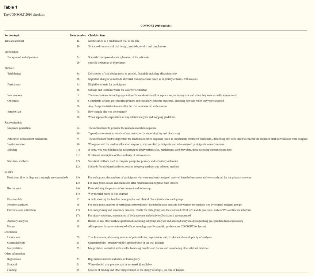 Si vous êtes ici, avec nous, à lire cet article de blog, c’est peut être que vous faites partie des ces kinés, en quête permanente de soins de qualité pour vos patients. Soyez rassurés ! Vous n’êtes pas les seuls dans ce cas là, et lire cet article jusqu’au bout vous le montrera ! L’une des méthodes adaptée pour offrir des soins optimaux à nos patients est de recueillir des informations en provenance d’articles scientifiques. Et dans ce domaine, les Essais Contrôlés Randomisés (ECR ou RCT en anglais) sont un maillon majeur sur lesquels reposent notre compréhension de la kinésithérapie et de la physiothérapie, ou du moins une partie. Nous y reviendront dans un futur article. L’objectif de cet article de blog n’est pas de retracer l’histoire des ECR, mais plutôt de découvrir ensembles, comment ce design d’étude a vu sa forme se stabiliser avec le temps. Pour ce faire, je vais vous parler des Critères CONSORT ! Sous le nom complet de CONsolidated Standards of Reporting Trials, la première mouture de CONSORT voit le jour en 1996 [1]. Il s’agit d’un ensemble de recommandations méthodologiques adressées dans un premier temps aux chercheurs produisant des ECR, mais aussi aux organismes de publication, et aux lecteurs. L’objectif d’une telle grille est de nous proposer une standardisation de la production d’ECR. CONSORT implique donc une standardisation :