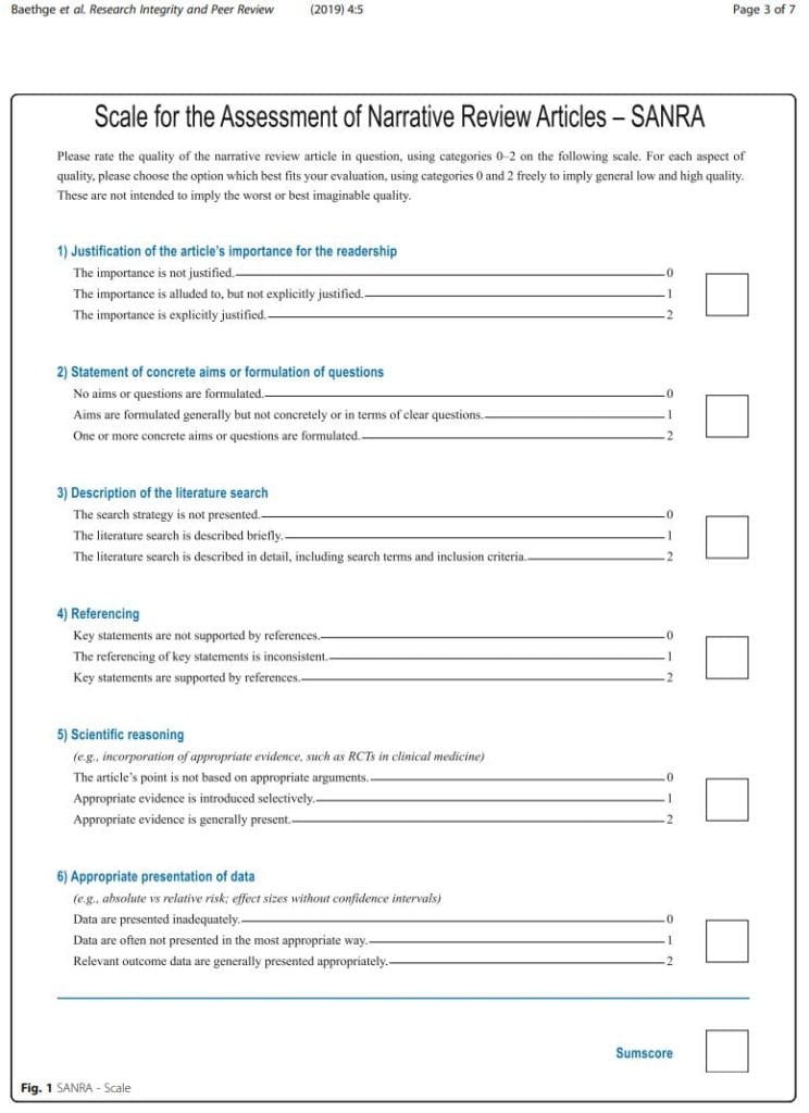 - Baethge, C., Goldbeck-Wood, S. & Mertens, S. SANRA—a scale for the quality assessment of narrative review articles. Res Integr Peer Rev 4, 5 (2019). https://doi.org/10.1186/s41073-019-0064-8*