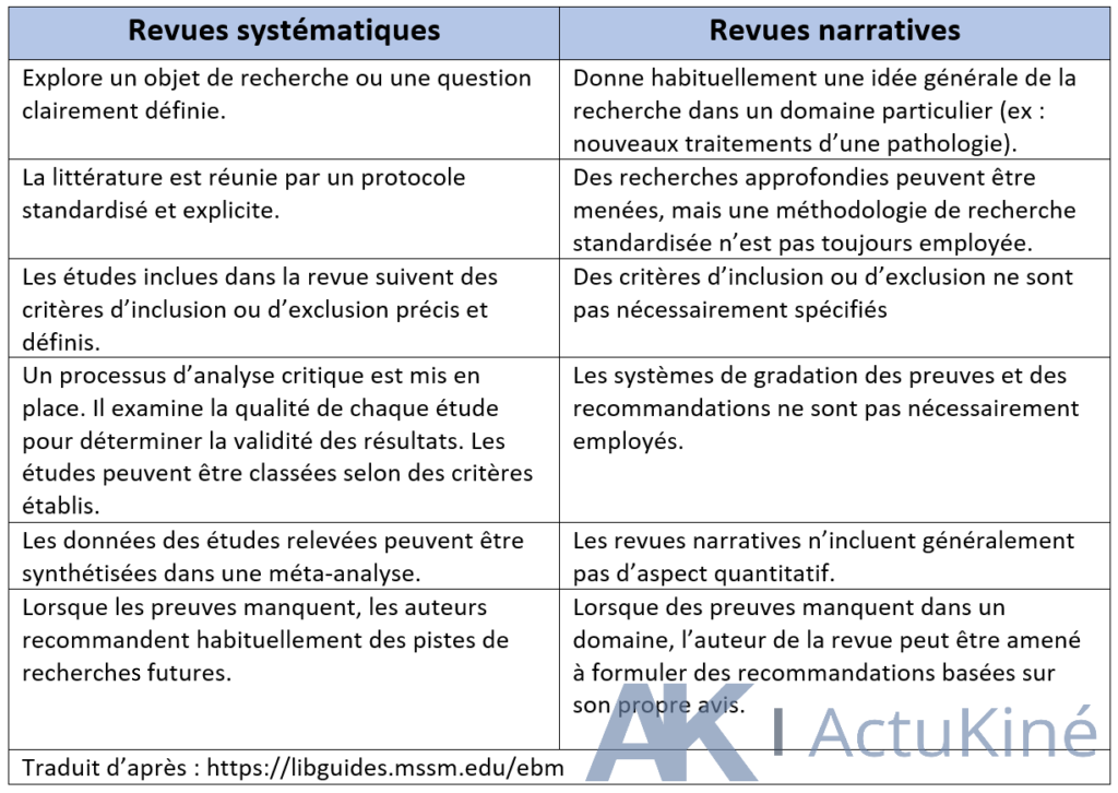 Cela ne signifie pas que les revues narratives ne peuvent être « evidence-based ». En revanche, leur utilité de « preuve » en tant que telle est à relativiser sérieusement.